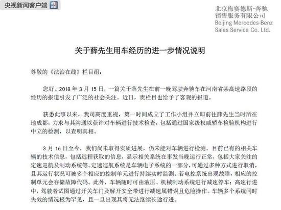 4月9日,奔驰公司向央视发布了一份《关于薛先生用车经历的进一步情况说明》。说明中提到,目前已有的相关车辆的技术信息,包括当晚从车辆中远程获取的信息,显示相关系统在事发当晚运行正常,包括大家关注的定速巡航及制动系统等。奔驰称,如果电控系统出现故障会存储故障代码,车辆多个系统同时失效极为罕见,一旦出现无法继续长途行进。