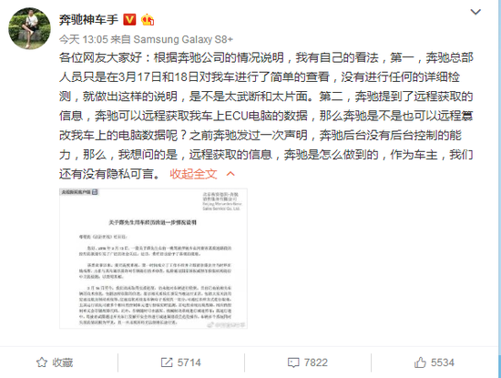 9号中午,奔驰车主薛先生发布微博回应奔驰说明,称奔驰没有进行任何的详细检测就做出说明,“太武断和太片面”。薛先生还质疑奔驰远程获取数据侵犯隐私,并猜测“奔驰是否可以远程篡改数据”。