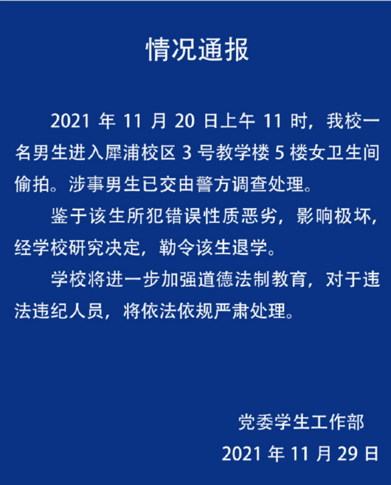 原标题:西南交通大学:一男生进入女卫生间偷拍,已将其交由警方调查并决定勒令其退学